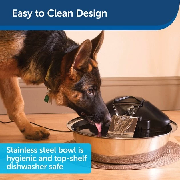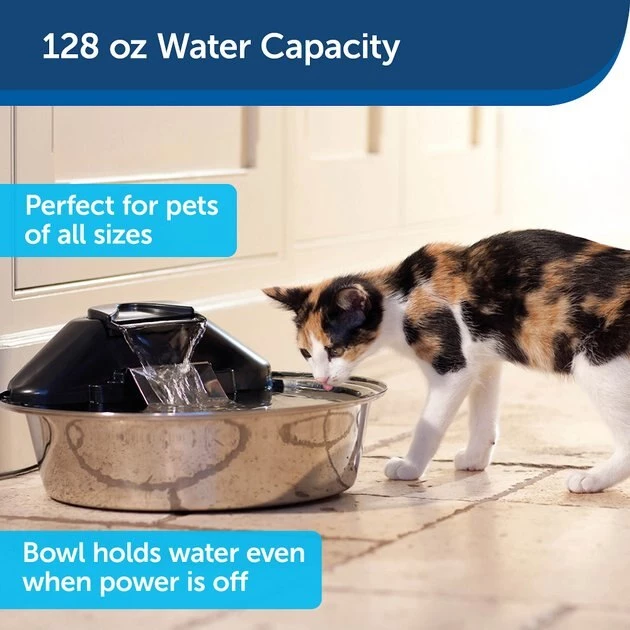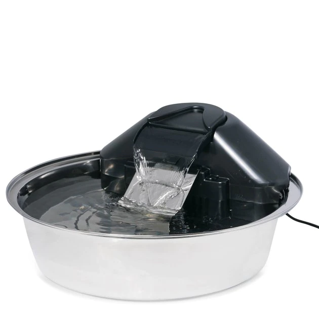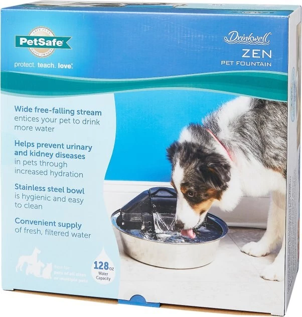 Smart pets know the secret to a peaceful, happy meal is having a blissful bowl to drink from! The Drinkwell Zen Pet Fountain holds a full gallon of water and continually filters, pumps, and aerates the water The free-falling stream keeps water fresh, encouraging pets to drink more and stay hydrated. The Zen Pet Fountain is dishwasher-safe and includes a stainless steel drinking bowl.