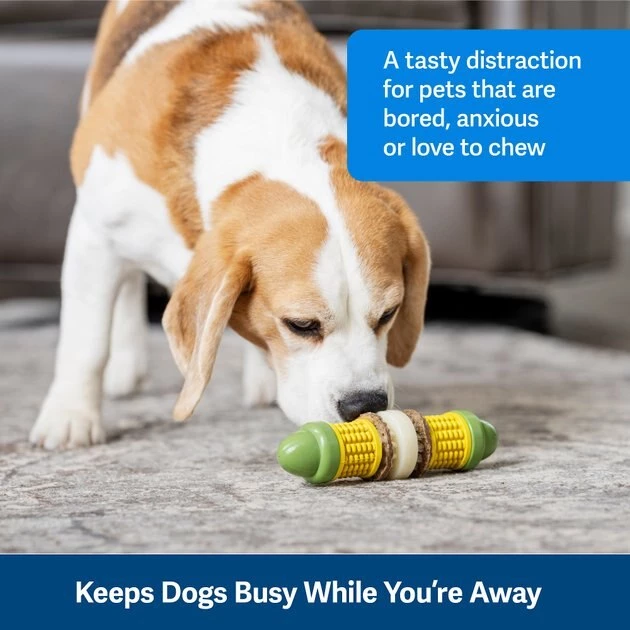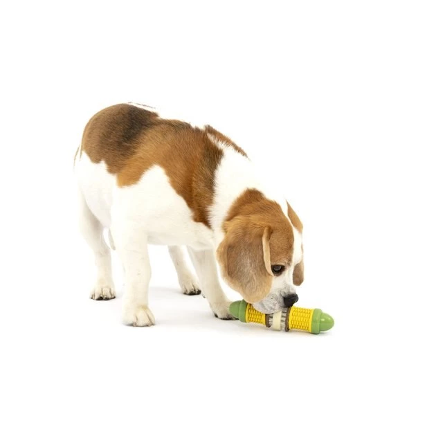 Let your best buddy join in on the family barbecue fun with this PetSafe Busy Buddy Cravin’ Corncob Chew Dog Toy! Simply place up to two treat rings on the toy by unscrewing the ends and sliding them on. For an additional treat and to keep your canine companion entertained, you can smear nut butter (or doggie toothpaste) on the corn kernels! The textured surface helps prevent and removes build-up as your pup chews, keeping her teeth and gums clean. This toy is essentially a clever toothbrush that looks and tastes like a snack! The BPA-free rubber is butter scented to keep your dog happy even after the treat rings are gone. Plus, the toy is top-rack dishwasher safe for easy cleaning.