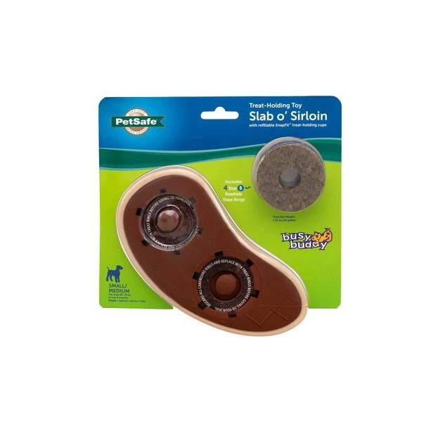 You can’t always give your pup the top-quality steak he deserves, but you can give him a top-quality toy that looks like one with the PetSafe Busy Buddy Slab o’ Sirloin Chew Dog Toy. Place two of the included treat rings in the refillable SnapFit treat-holding cups. For even further enjoyment and long-lasting entertainment, you can also spread nut butter (or doggie toothpaste) in the grooves on the back of the toy! The textured surface of the toy helps keep your pooch’s teeth and gums clean by preventing and removing build-up as he chews. The PetSafe Busy Buddy Slab o’ Sirloin Chew Dog Toy is essentially a clever toothbrush that looks and tastes like a snack! The BPA-free rubber is beef scented to keep your dog happy even after the treat rings are gone. Plus, the toy is top-rack dishwasher safe for easy cleaning!