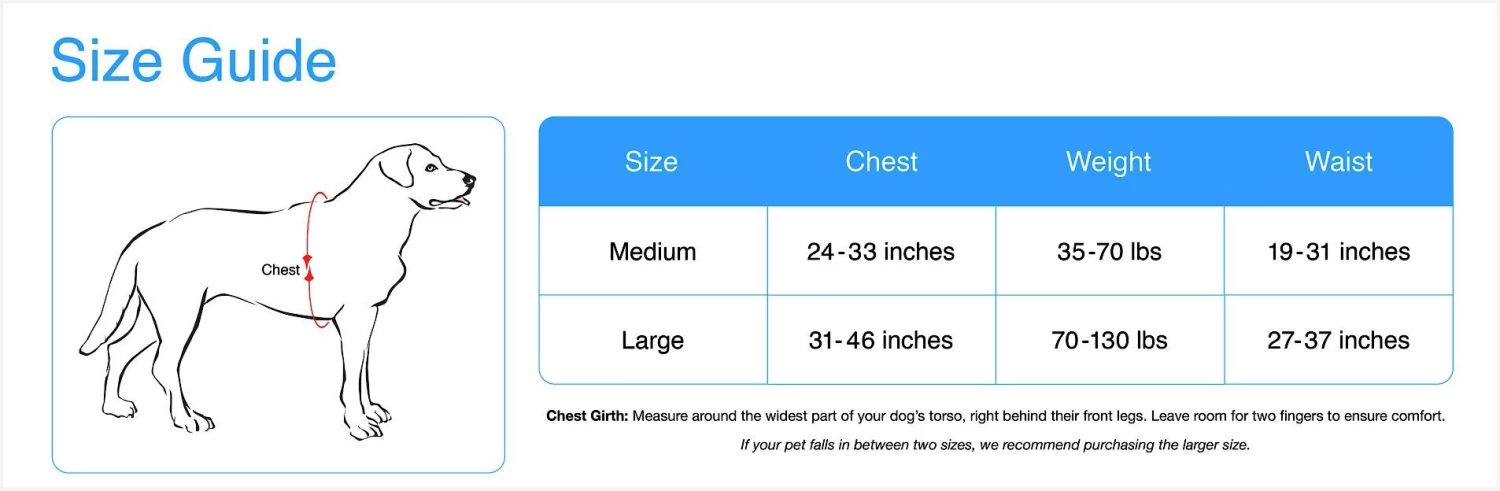 Chest Girth: Measure around the widest part of your dog’s torso, right behind the front legs. Leave room for two fingers to ensure comfort.