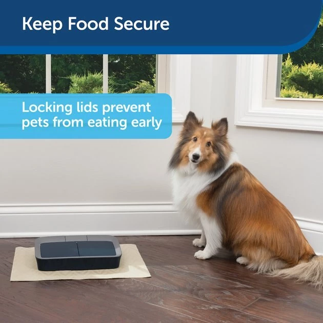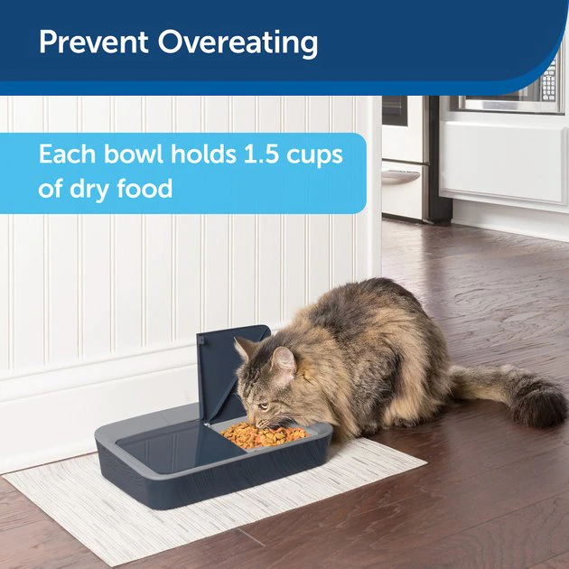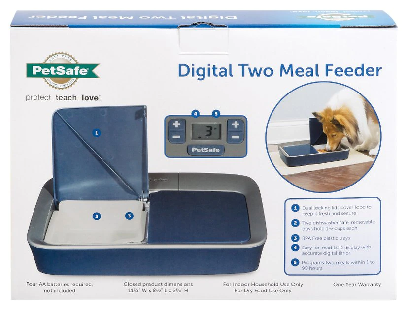 The PetSafe Digital 2-Meal Dog & Cat Feeder is an easy-to-use automatic pet feeder. Its compact figure fits anywhere in your home and is designed to prevent curious pets from breaking in for an early snack. The two food compartments hold up to 1.5 cups each and the digital timer allows you to set feeding times. You can now manage your pet’s weight by controlling his portions, preventing overeating, and keeping him on a regularly scheduled diet. Plus, the removable food trays are dishwasher-safe for easy cleaning.