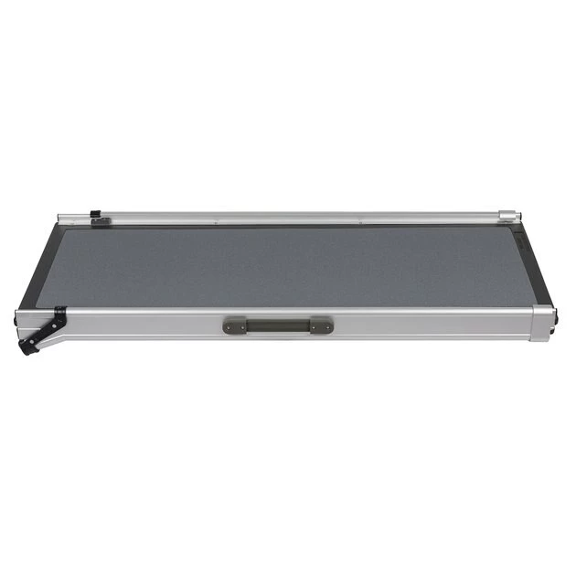 The aluminum rails on the ramp are pre-lubricated with household paraffin wax. Some of this wax may flake off after repeated use of the ramp. Re-application of this wax should not be necessary under normal use. If the plastic or aluminum parts of the Pet Ramp become dirty, simply clean with any standard household cleaner. The tread material can be cleaned with mild detergent and a stiff brush, or a strong jet of water. The Ramp should be maintenance-free.