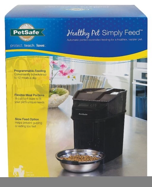 Say goodbye to the early morning wake up “meow” or nose boop. The Healthy Pet Simply Feed will serve your pet breakfast so you can get more shuteye. The feeder portions your pet’s meals to help you manage their weight and keep them healthy and happy. If you have a pet who eats too quickly, the feeder can dispense meals larger than 1/8 cup a little at a time over 15 minutes with its unique slow feed feature. You can schedule up to 12 meals per day from 1/8 – 4 cup portions. This feeder holds 24 cups of dry or semi-moist food and dispenses it using our uniquely designed conveyor system. The pet-proof dispenser is designed to keep pets from sneaking food out of the feeder, and all food contact parts are washable. To clean, place the stainless steel bowl, bowl holder, lid and hopper in your dishwasher and hand wash the conveyor system. Your pet deserves the best. Trust PetSafe to keep your pet healthy, safe and happy.
