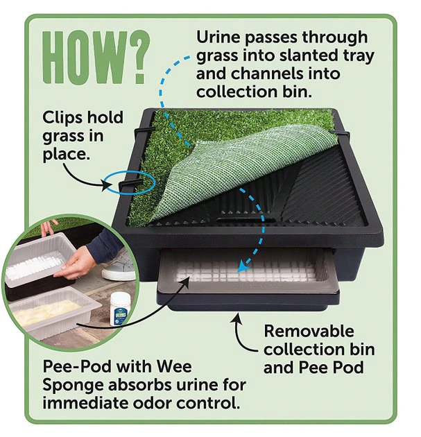 Pet Loo with Slanted Tray and Reinforced Base, Synthetic Grass Mat, Collection Bin, Pee-Pod Liner, Wee Sponge Urine and Odor Absorber, (4) Grass Mat Clips.