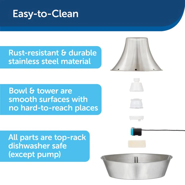 - With 360 construction, the fountain gives pets the option to drink from the tower or bowl, catering to the pickiest drinkers.