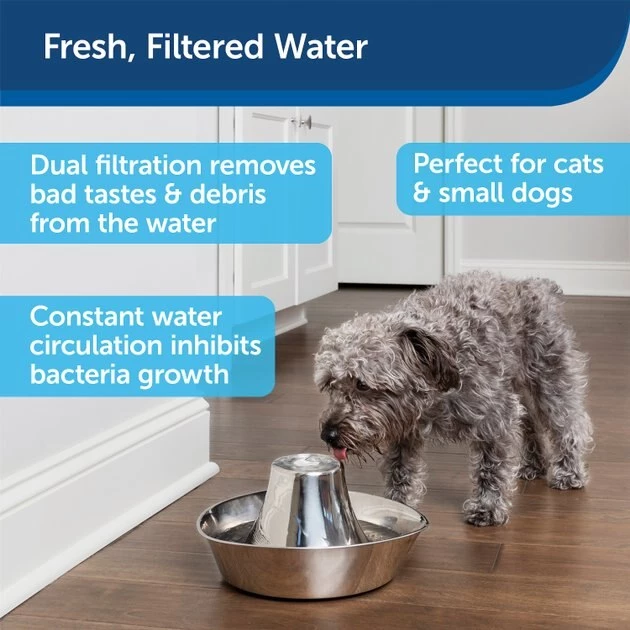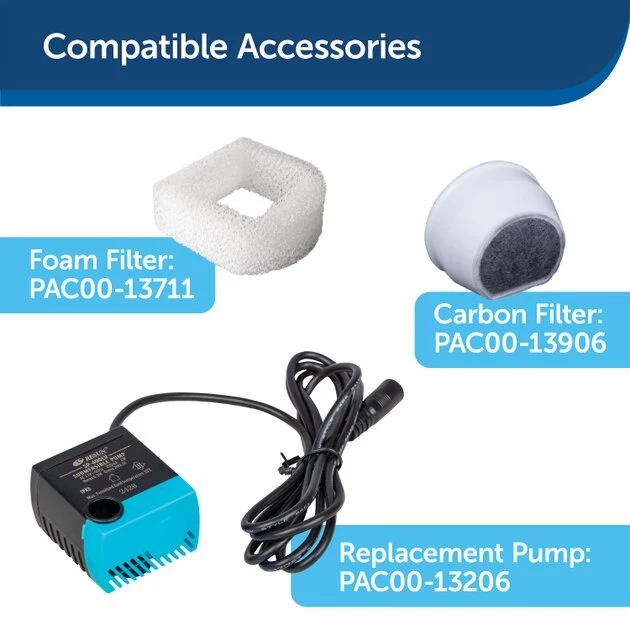 Seaside Stainless Pet Fountain, Replaceable Carbon Filter, Replaceable Foam Filter, Quick Start Guide