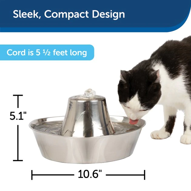 Gulp, gulp, gulp; the sound of your furry family member imbibing in delectable hydration is the only thing you’ll be hearing out of this quiet fountain! The PetSafe Seaside Food-Grade 304 Stainless Fountain was designed to help increase dogs’ and cats’ drive to drink by mirroring the forbidden flow of the kitchen sink instead of a stagnant bowl. This unit holds 60-oz of flowing water, encouraging your furry little one to drink more. This fountain also comes with a pump, carbon filter and a foam filter to help remove pet hair, saliva, and unpleasant tastes from the water. And it’s made from hygienic, easy-to-clean, scratch- and rust-resistant materials that can help prevent the formation of pet acne. When it comes time to clean the fountain, simply clean the pump by hand and place the tower and bowl on the top shelf of your dishwasher!