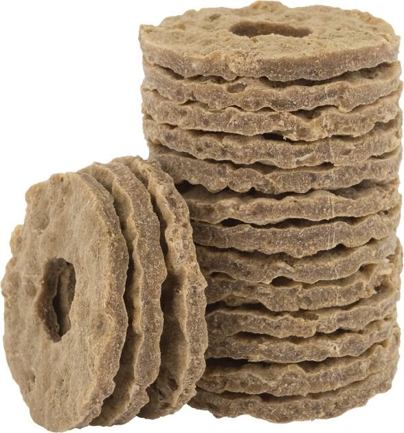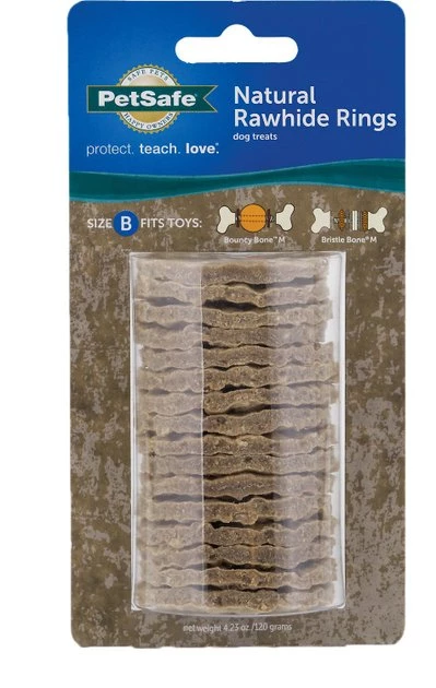 The PetSafe Sportsmen Rawhide Rings Dog Treats comes with sixteen natural rawhide treat rings to refill your PetSafe Sportsmen and Busy Buddy toys. You can make playtime last longer by adding these treat refill rings to your dog’s favorite toy, and the original rawhide flavor is sure to be a hit for your pup. Your dog will spend hours playing in hopes of getting this tasty treat off of the toy and into his belly. These delicious treats are compatible with the Bouncy Bone, Bristle Bone, Nobbly Nubbly, and Jack.