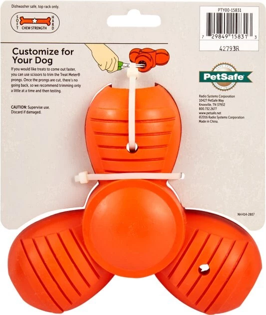- This toy includes three treat chambers with the patented Treat Meter prong-design.