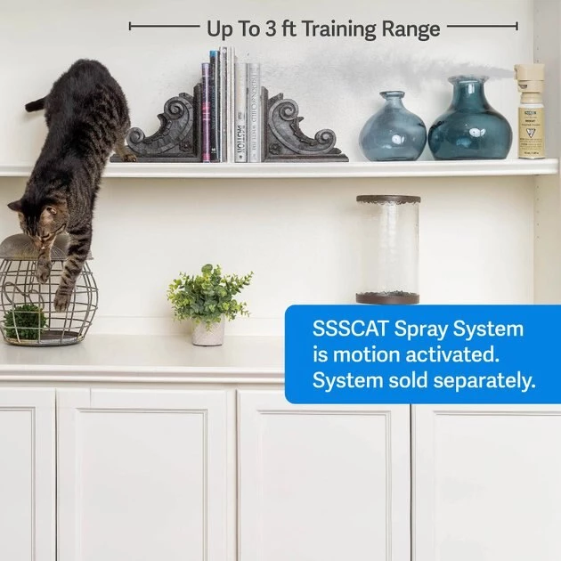 The PetSafe SSSCAT Deterrent Cat Spray Replacement Can works with the PetSafe SSSCAT Deterrent Cat Spray. This unique spray uses motion-activated infrared to monitor movement up to 3 feet away. When the SSSCAT detects your pet entering an off-limit area, it emits a harmless, odorless and stainless spray to deter your pet from continuing. It’s great for keeping your cat off the counter, your dog away from the trashcan, or any of your furry friends from scratching or climbing on the furniture!