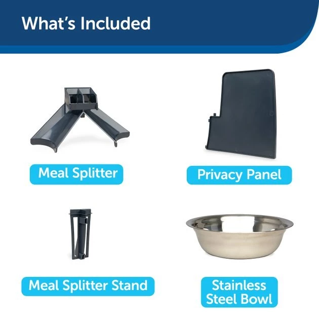 - Each kit comes with a meal splitter, an optional privacy panel plus one extra stainless steel bowl so your furry friends can confidently enjoy their own bowl at mealtime.