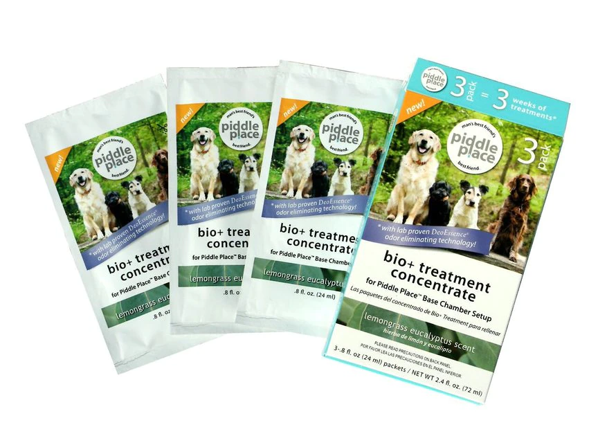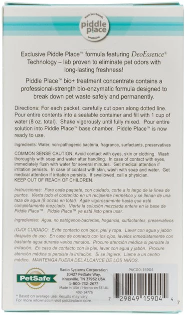 Keep your indoor toilet clean and fresh with the Piddle Place Bio+ Treatment Turf Pad Maintenance Refill for Dogs & Cats. For use with the Piddle Pad indoor toilet, it features the lab-proven DeoEssence Technology, which eliminates pet odors and replaces them with long-lasting freshness. The bio-enzymatic formula actually breaks down the pet waste safely to permanently remove it, rather than just covering it up. Just mix the concentrate with water, and keep enough fluid in the base to blend and neutralize the incoming waste.