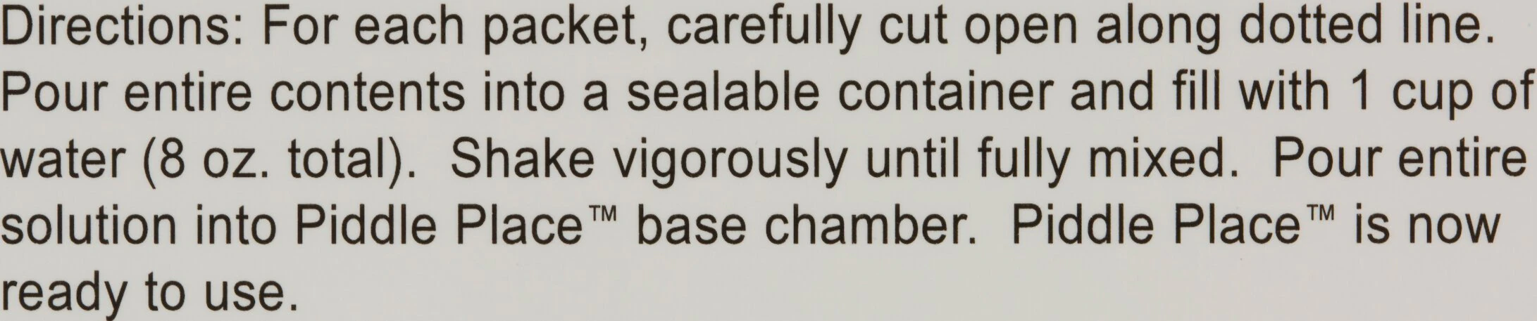 For each packet, carefully cut along the dotted line. Pour entire contents into a sealable container and fill with 1 cup of water (8 oz total). Shake vigorously until fully mixed. Pour entire solution into Piddle Place base chamber. Piddle Place is now ready to use.