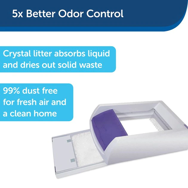 Simplify litter box maintenance and keep your home smelling fresh with ScoopFree Sensitive Crystal Cat Litter Tray Refills. These convenient trays are specifically designed to work with the PetSafe ScoopFree Self-Cleaning Cat Litter Box, and because theyโre completely disposable, you never have to see, touch or smell messy waste. Each tray is pre-filled with 4.5 pounds of Sensitive Crystals cat litter that’s free of perfumes and dyes, and reduces odor better than traditional clay or clumping litter. Simply replace the disposable tray every few weeks, and your ScoopFree cat litter box is just like new.